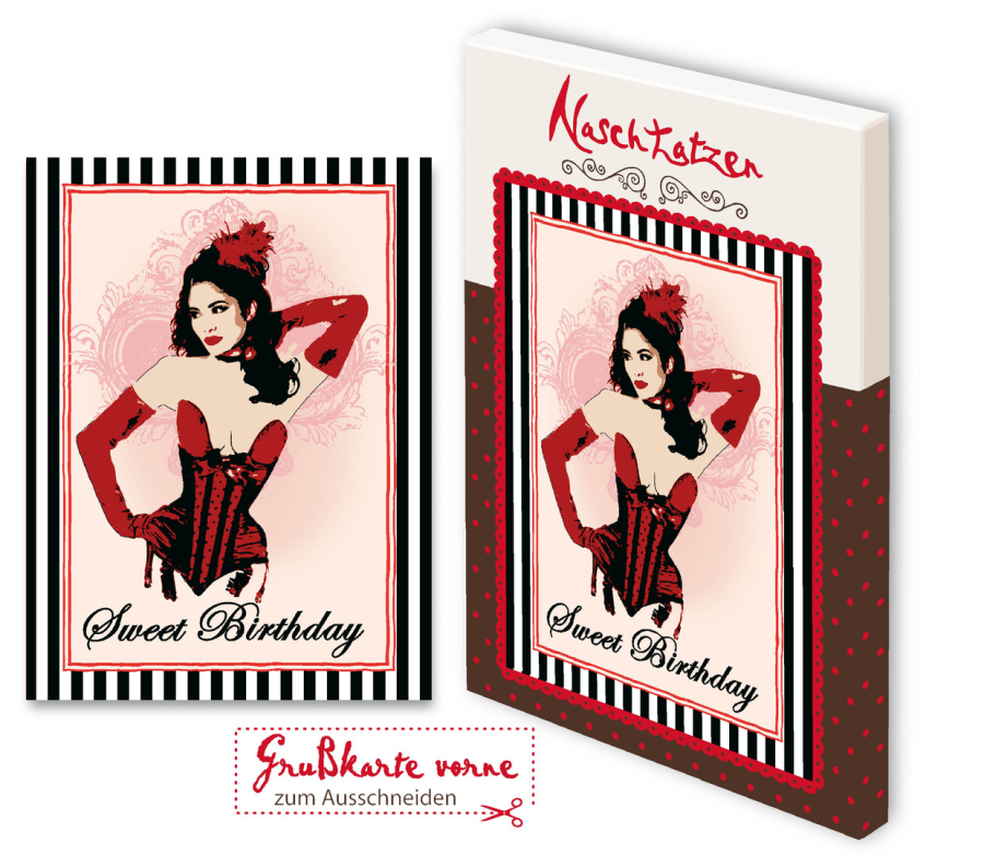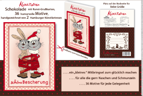 Feinste Vollmilchschokolade, 24 Täfelchen befinden sich in jeder handgezeichneten, humorvollen Kunstgrußkarte. Eine liebevoll gestaltete Rückseite bietet die Möglichkeit für persönliche Grüße und Wünsche. Die individuellen Grußkarten sind leicht durch eine Perforierung aus der Verpackung zu lösen.